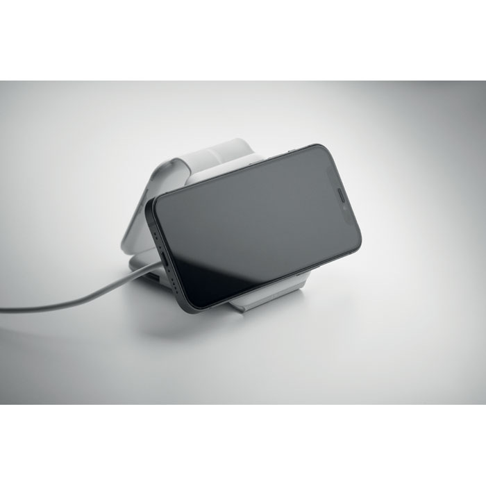 Magnetická nabíjecí stanice z ABS. 3 plochy pro bezdrátové nabíjení. 1x 15 W, 1x 5 W pro TWS a 1 nabíječka pro Apple Watch (3 W). 2 konektory Type-C a 2 konektory USB-A. Integrovaný kabel.