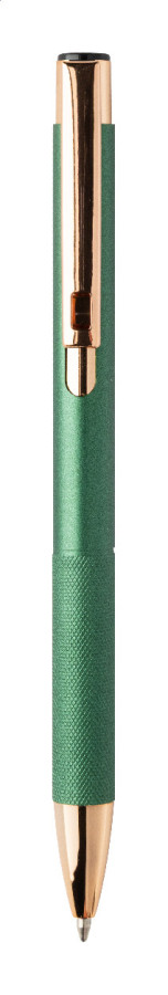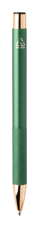 Guľôčkové pero z recyklovaného hliníka s matným telom, textúrovaným úchopom a detailmi ružového zlata. So špeciálnym povrchom na zrkadlové laserové gravírovanie vo farbe ružového zlata. S modrou náplňou.