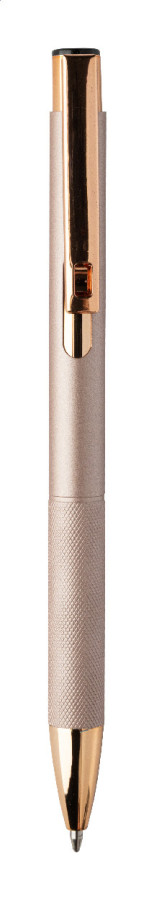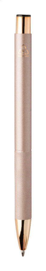 Guľôčkové pero z recyklovaného hliníka s matným telom, textúrovaným úchopom a detailmi ružového zlata. So špeciálnym povrchom na zrkadlové laserové gravírovanie vo farbe ružového zlata. S modrou náplňou.