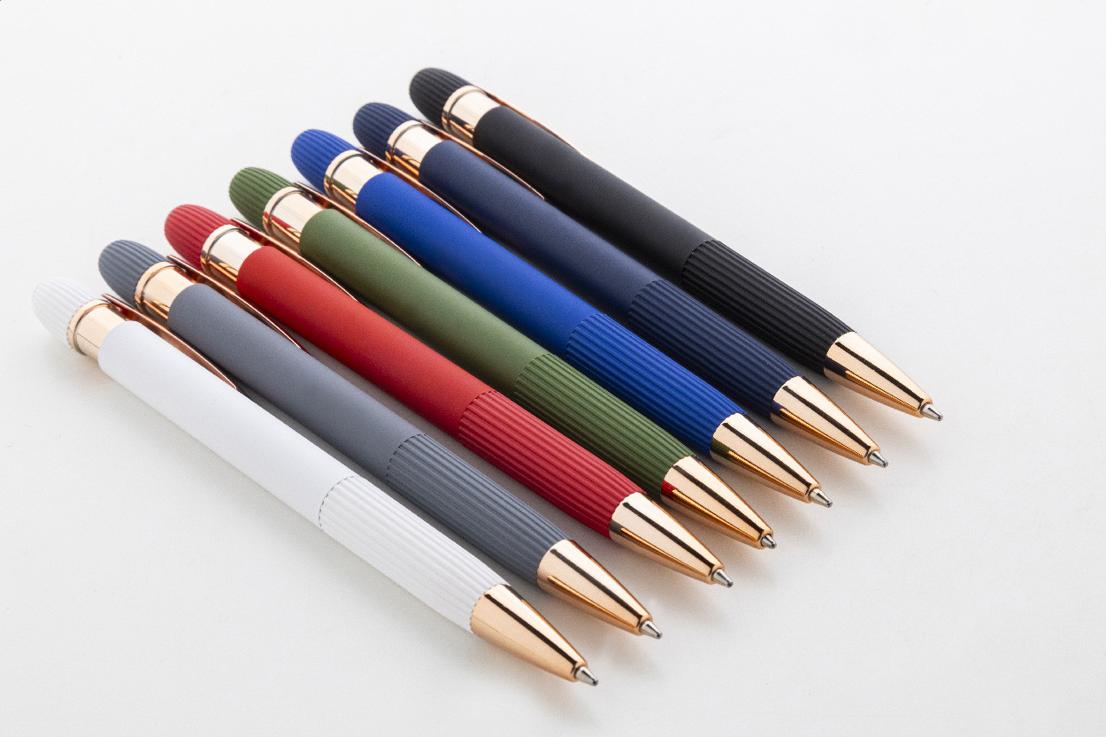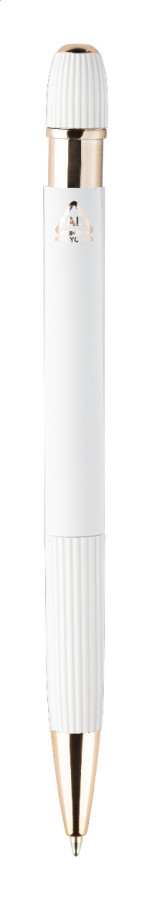 Guľôčkové pero z recyklovaného hliníka s pogumovaným telom a detailmi v ružovo-zlatej farbe.