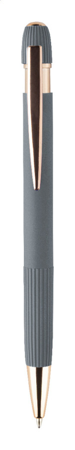 Guľôčkové pero z recyklovaného hliníka s pogumovaným telom a detailmi v ružovo-zlatej farbe.