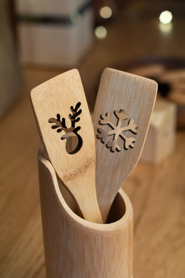Bambusová lyžica na varenie s vyrezávaným dizajnom vianočného stromčeka.