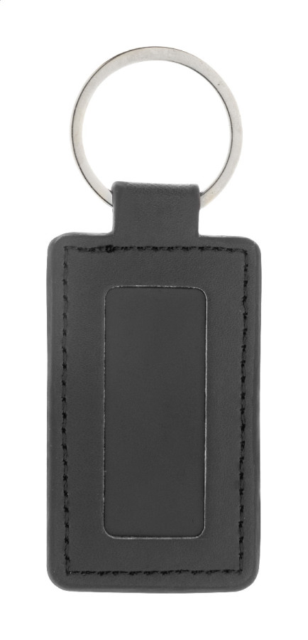 Obdĺžnikový prívesok na kľúče z recyklovanej PU kože s kovovým krúžkom a nerezovou doštičkou s logom a pogumovanou úpravou. So špeciálnym povrchom na zrkadlové laserové gravírovanie.