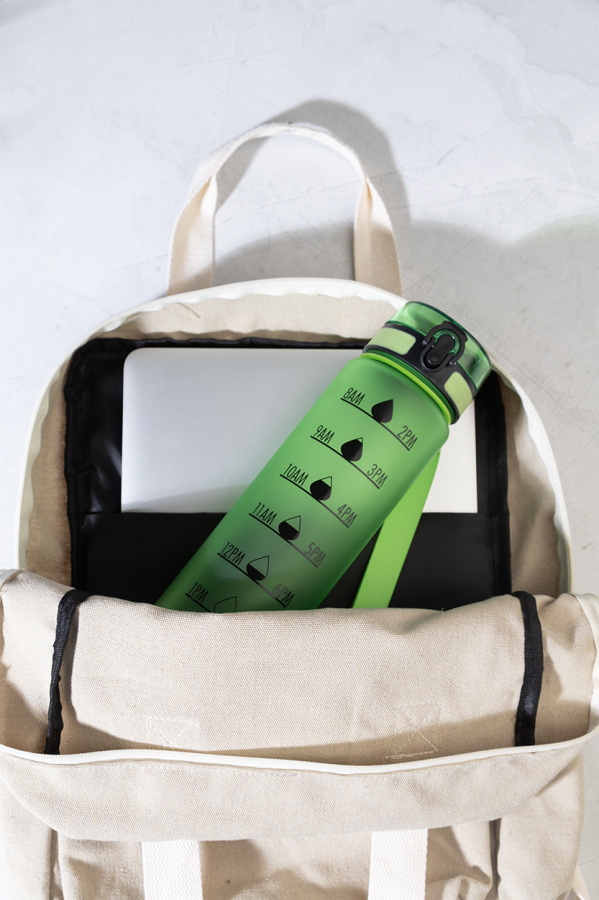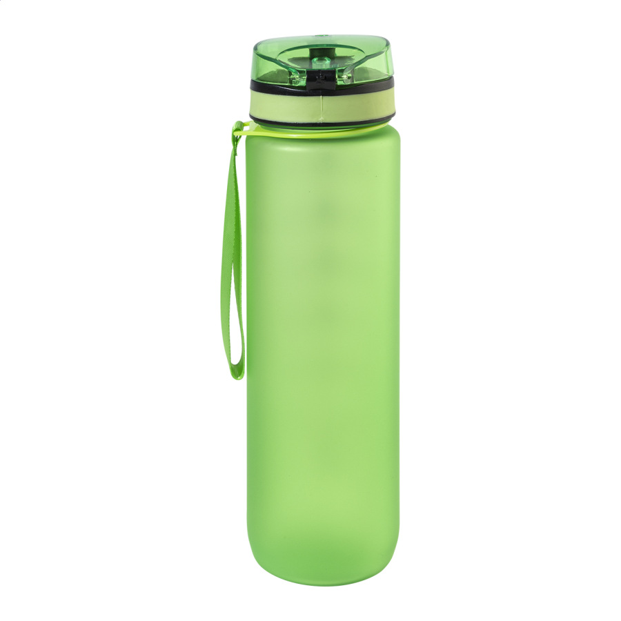 Športová fľaša z matného RPET s motivačným objemovým a časovým značením, s automaticky otvárateľným odklápacím viečkom s bezpečnostným zámkom a pútkom na nosenie. 1000 ml. Bez BPA. Nevhodné pre sýtené nápoje.