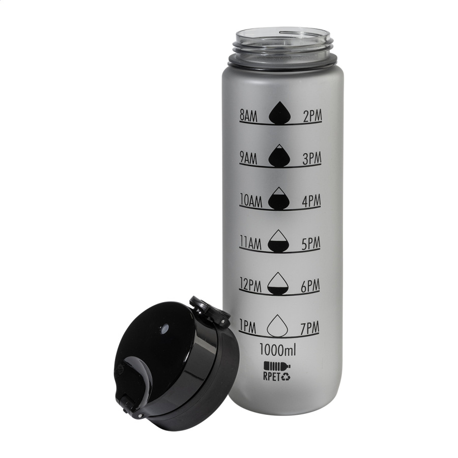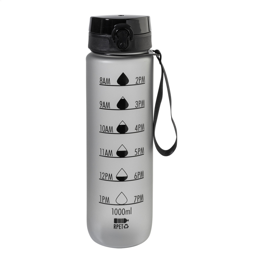 Športová fľaša z matného RPET s motivačným objemovým a časovým značením, s automaticky otvárateľným odklápacím viečkom s bezpečnostným zámkom a pútkom na nosenie. 1000 ml. Bez BPA. Nevhodné pre sýtené nápoje.