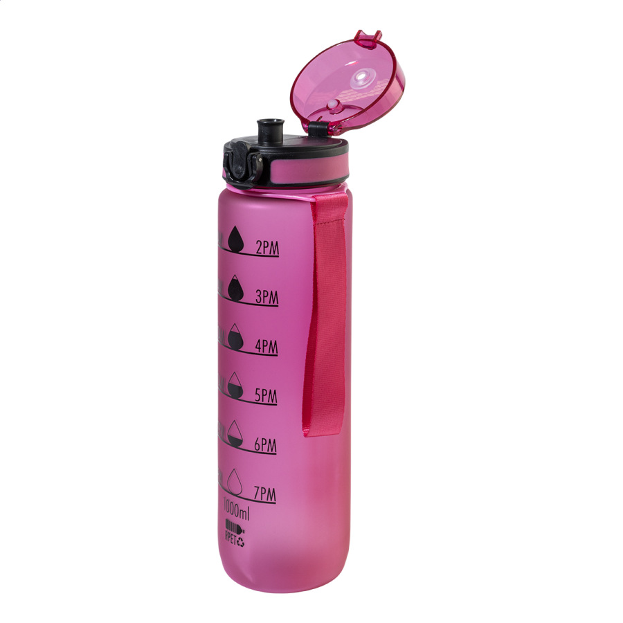 Športová fľaša z matného RPET s motivačným objemovým a časovým značením, s automaticky otvárateľným odklápacím viečkom s bezpečnostným zámkom a pútkom na nosenie. 1000 ml. Bez BPA. Nevhodné pre sýtené nápoje.