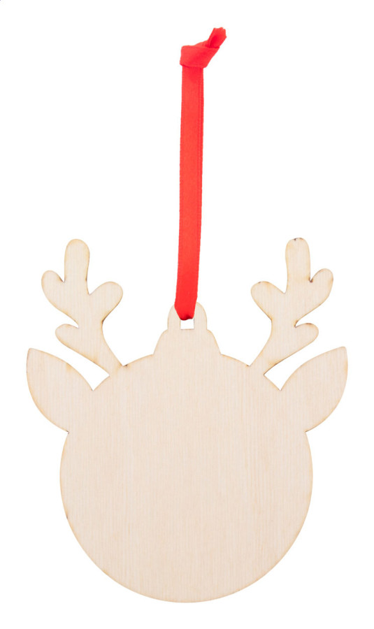 Vianočná ozdoba z brezovej preglejky s potlačeným vianočným vzorom a červenou stuhou, ktorá sa dodáva samostatne.