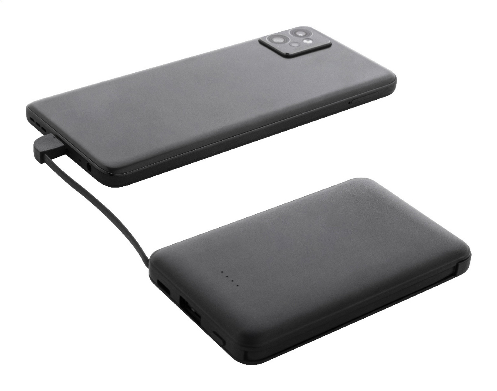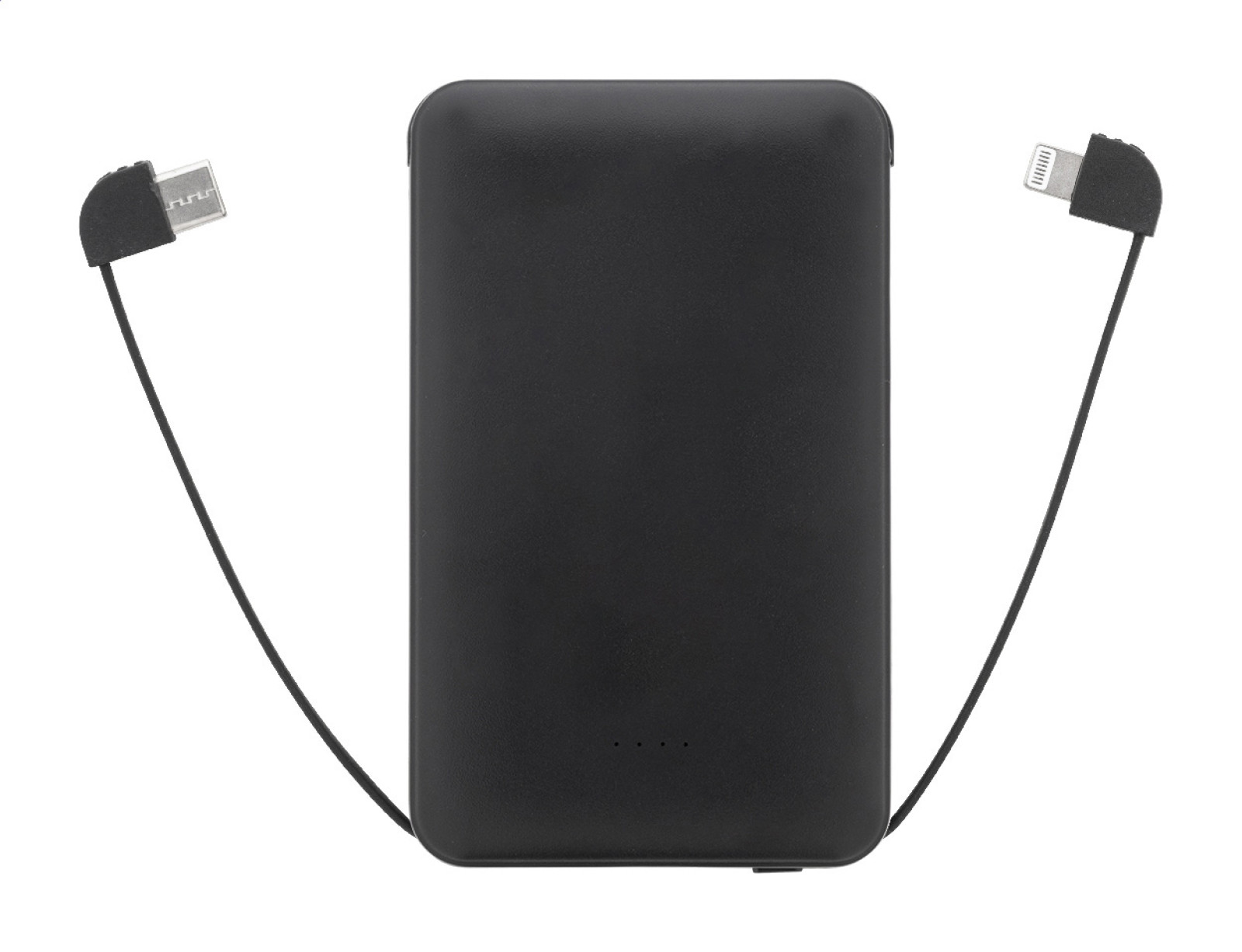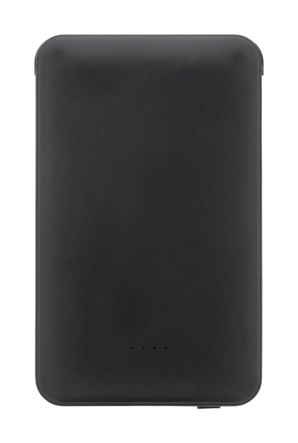 Power banka z recyklovaného ABS plastu s batériou 5 000 mAh a integrovanými nabíjacími káblami s konektormi micro USB, USB-C a Lightning. S nabíjacím portom USB a vstupným portom USB-C. Vrátane nabíjacieho kábla USB.