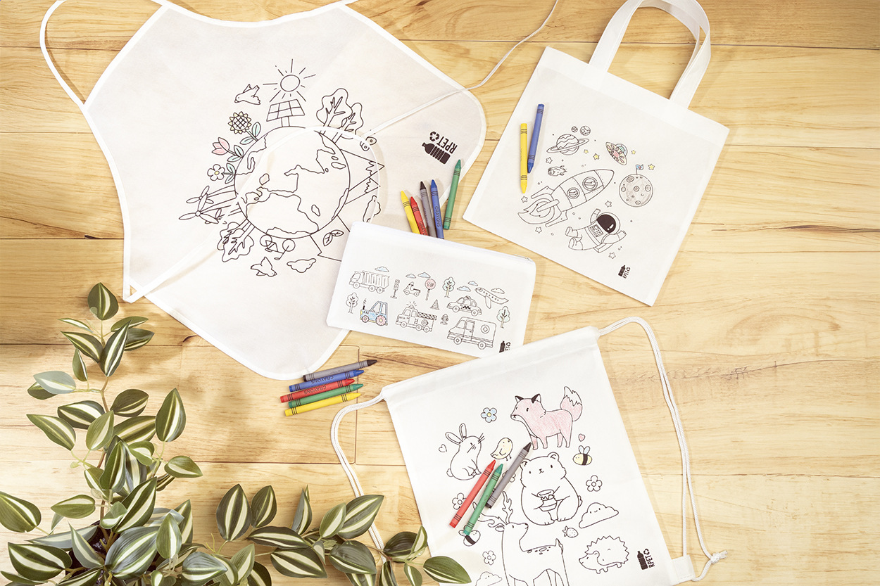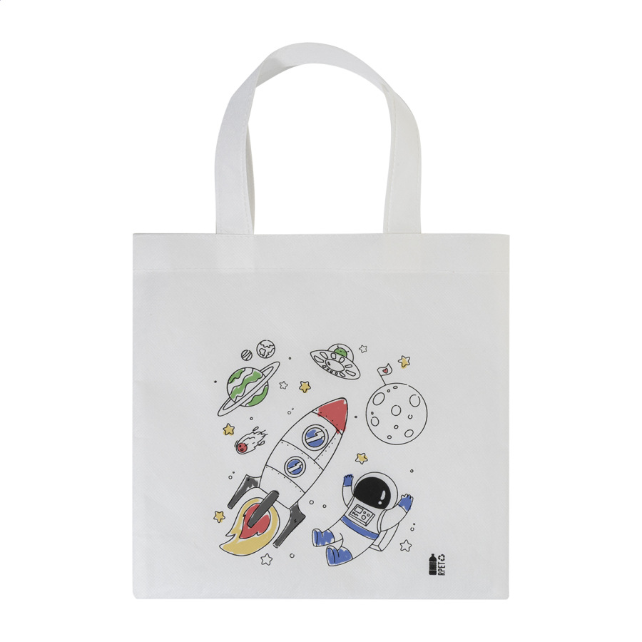 Mini nákupná taška z netkanej RPET tkaniny s 5 voskovkami na vyfarbenie.