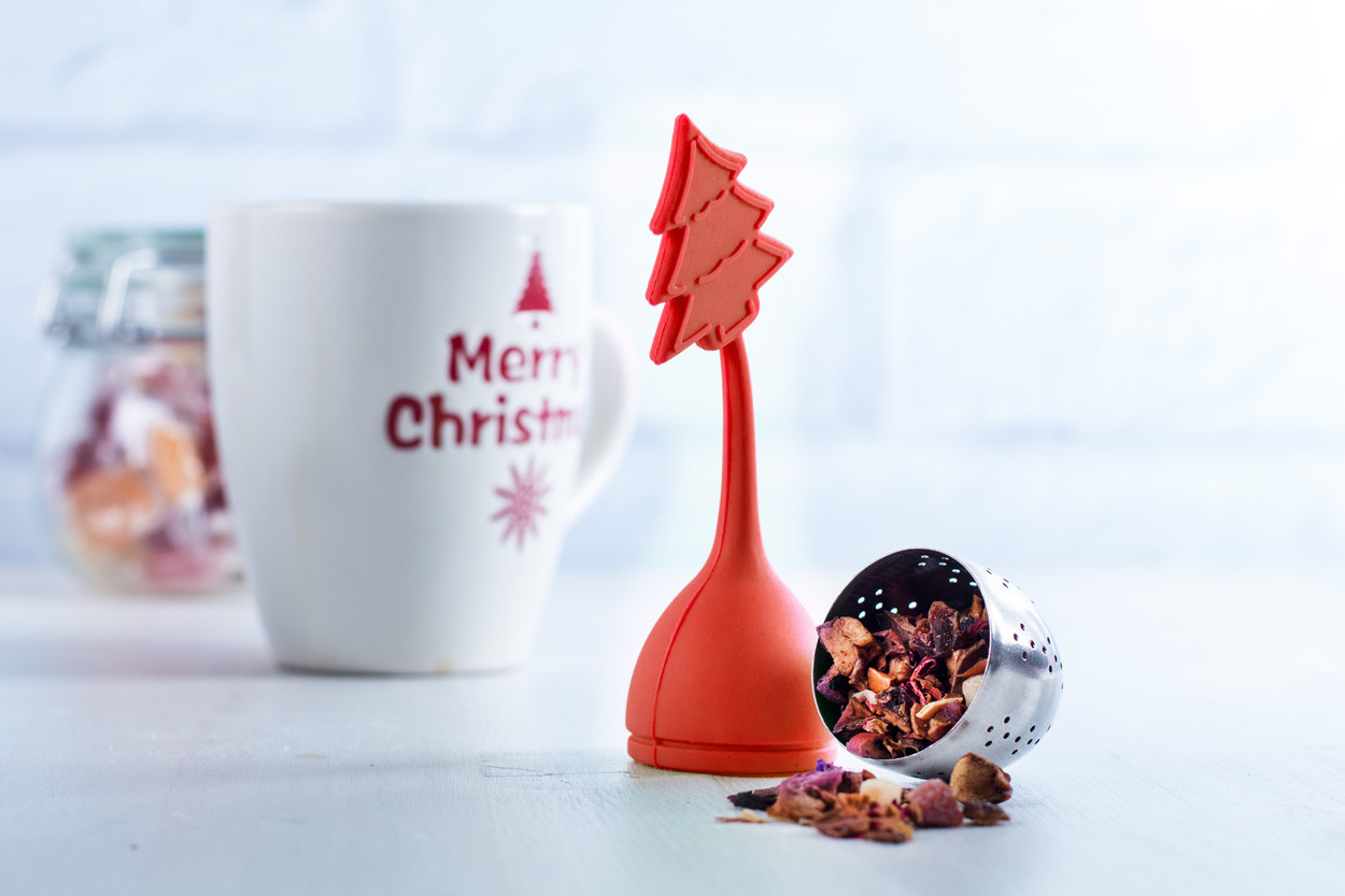 Sitko na čaj zo silikónu a nehrdzavejúcej ocele v tvare vianočného stromčeka.