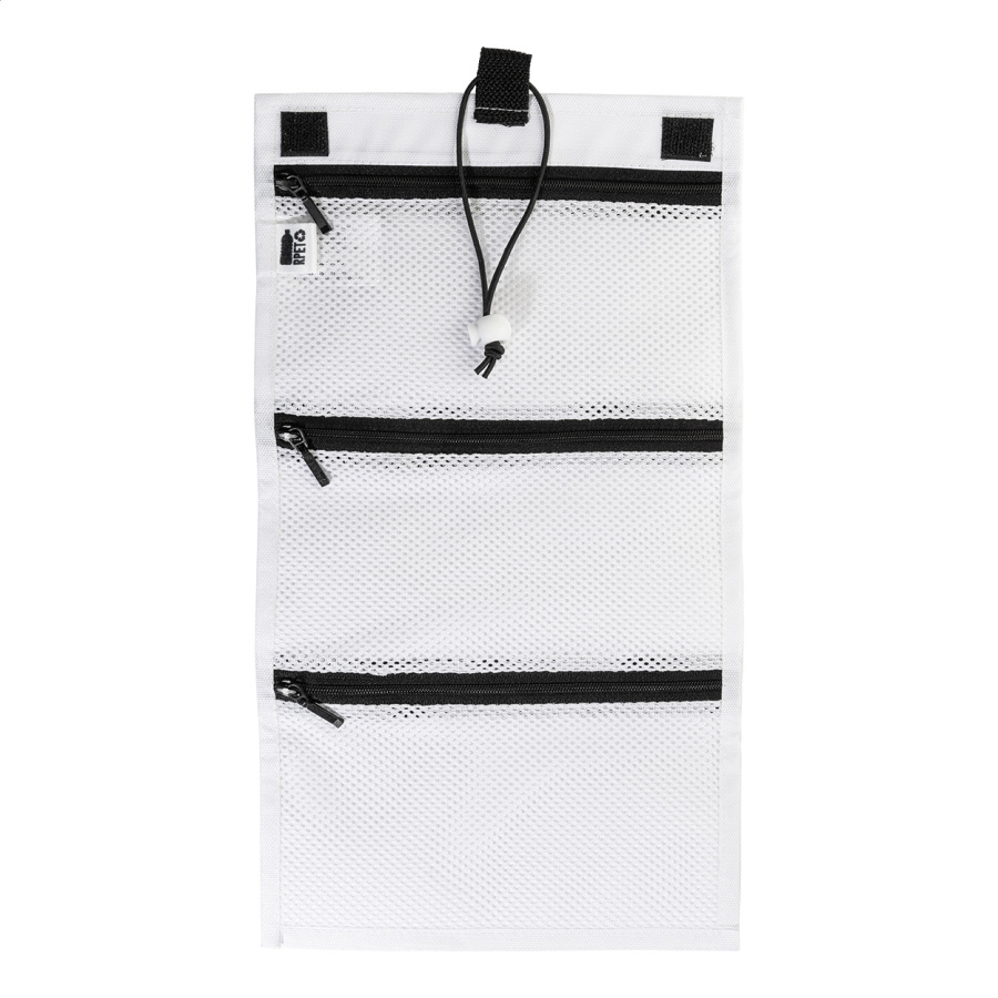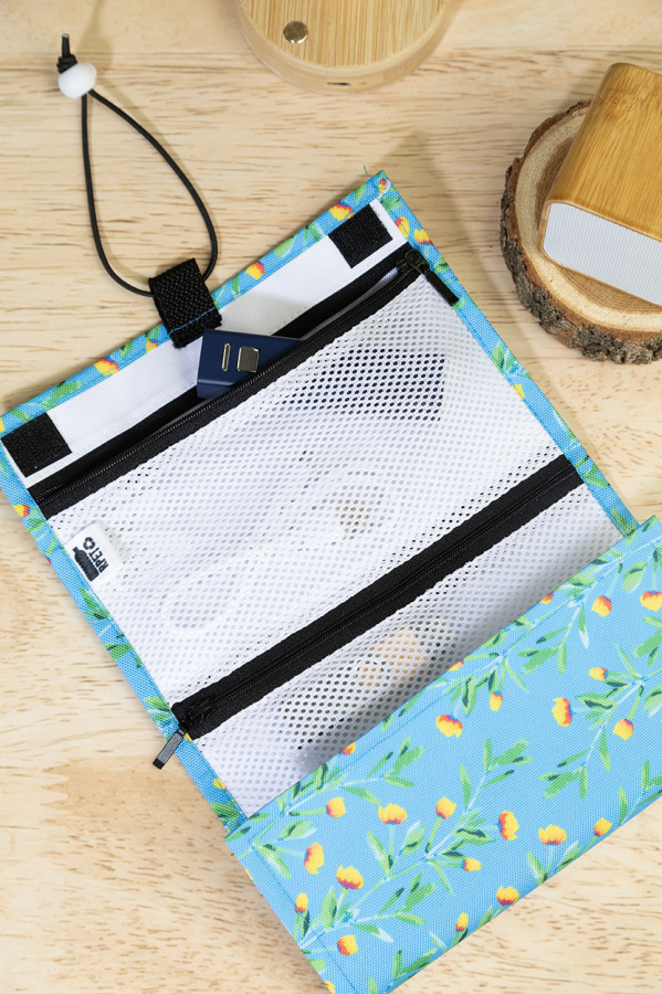 Rolovacia taška na káble na zákazku z RPET s 3 sieťovanými vreckami na zips a elastickým zapínaním. S celoplošnou sublimačnou potlačou. 600D RPET polyester s výrazným RPET štítkom. Cena nezahŕňa tlačovú prípravu. Min. mn.: 25 ks.