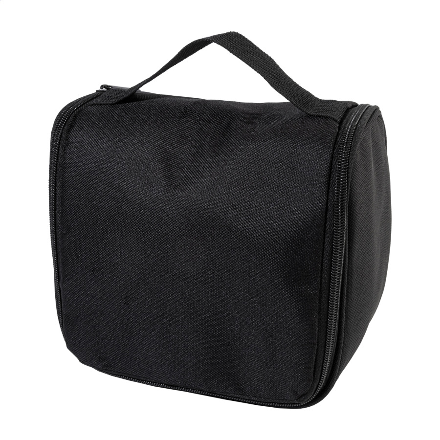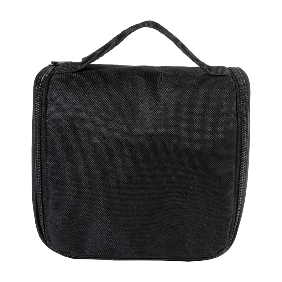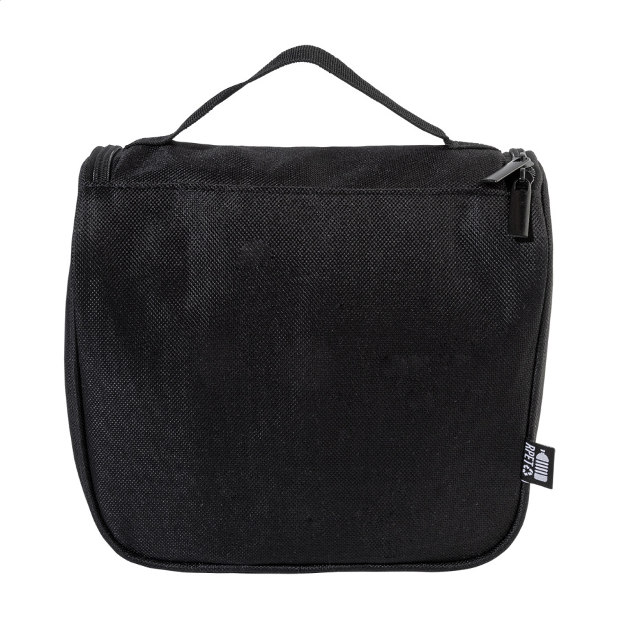 Závesná kozmetická taška z RPET s vnútornými priehradkami na zips a sieťovanými vreckami. 600D RPET polyester s charakteristickým štítkom RPET.