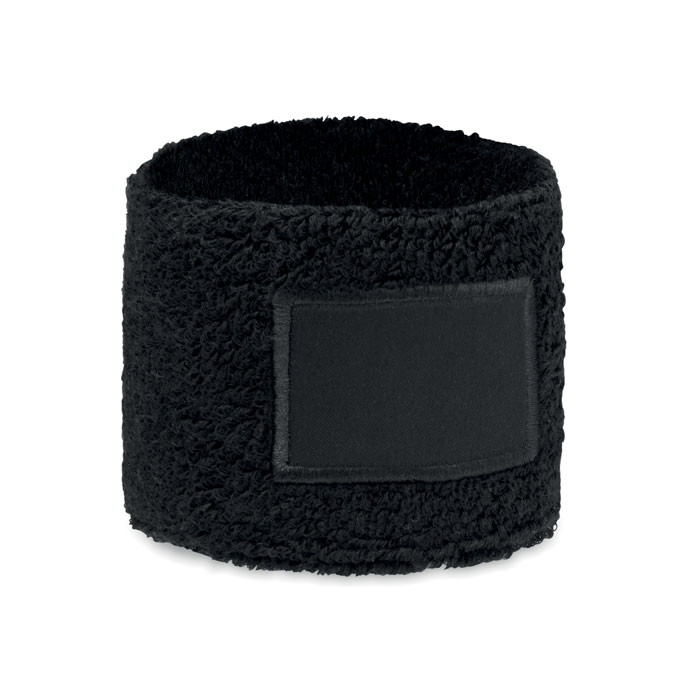 Potítko na zápěstí z polybavlny (79% bavlna, 13 % elastan, 8 % polyester) s bavlněnou nášivkou pro potisk.