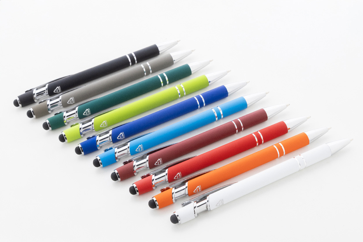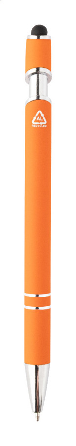 Guľôčkové pero a pero na dotykovú obrazovku z recyklovaného hliníka s pogumovaným telom a chrómovanými detailmi. S modrou náplňou.
