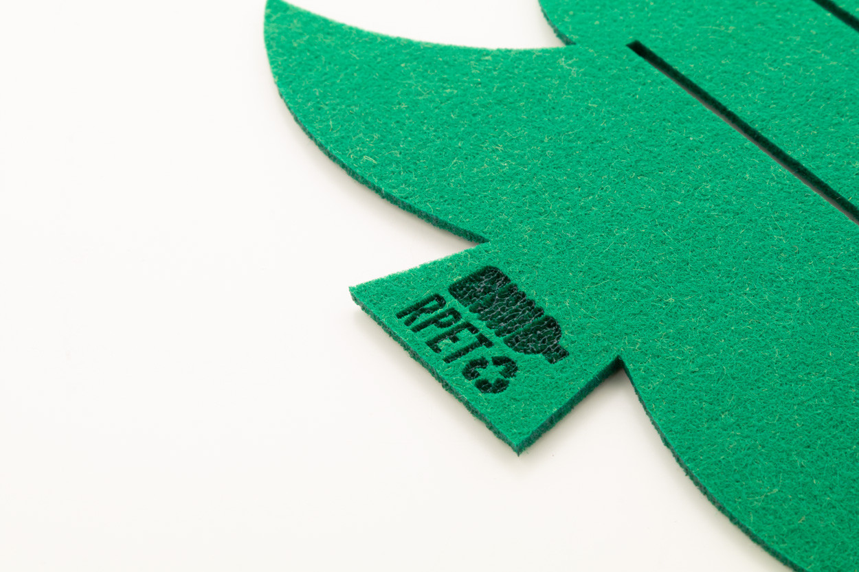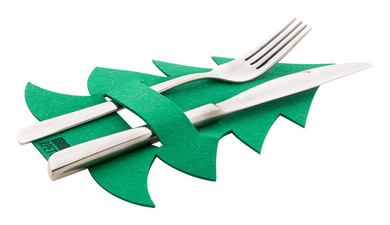 Súprava 4 ks RPET plstených držiakov na príbory v tvare vianočného stromčeka. V kraftovej papierovej krabici.