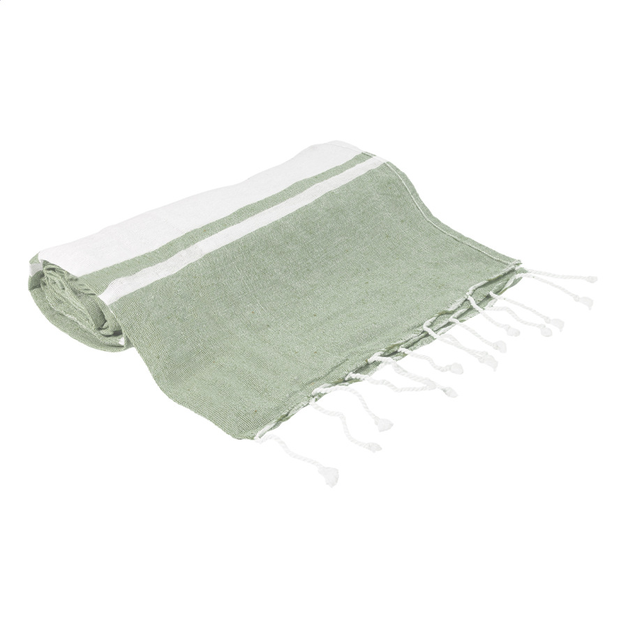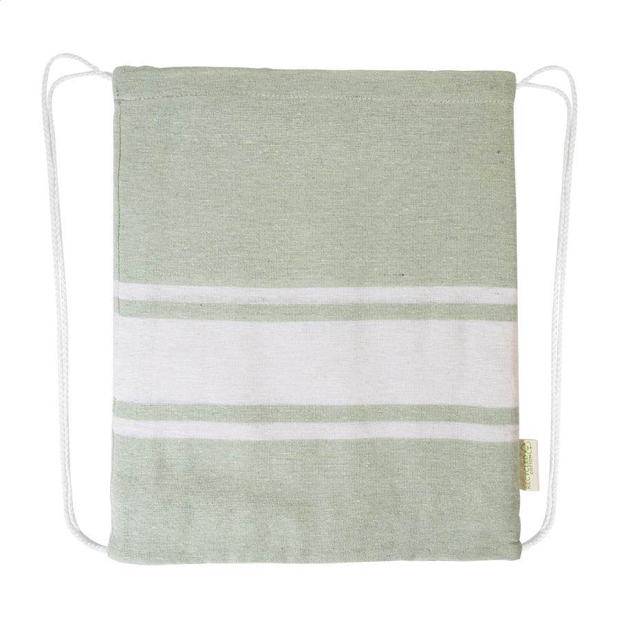 Dvojfarebná plážová osuška pareo s integrovaným sťahovacím vakom. 70% recyklovanej bavlny a 30% RPET polyesteru, 180 g/m².