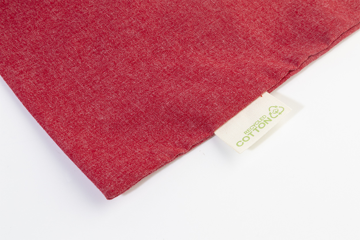 Nákupná taška s dlhými ušami zo 70% recyklovanej bavlny a 30% RPET polyesteru, 140 g/m². S výraznou etiketou o recyklovanej bavlne.