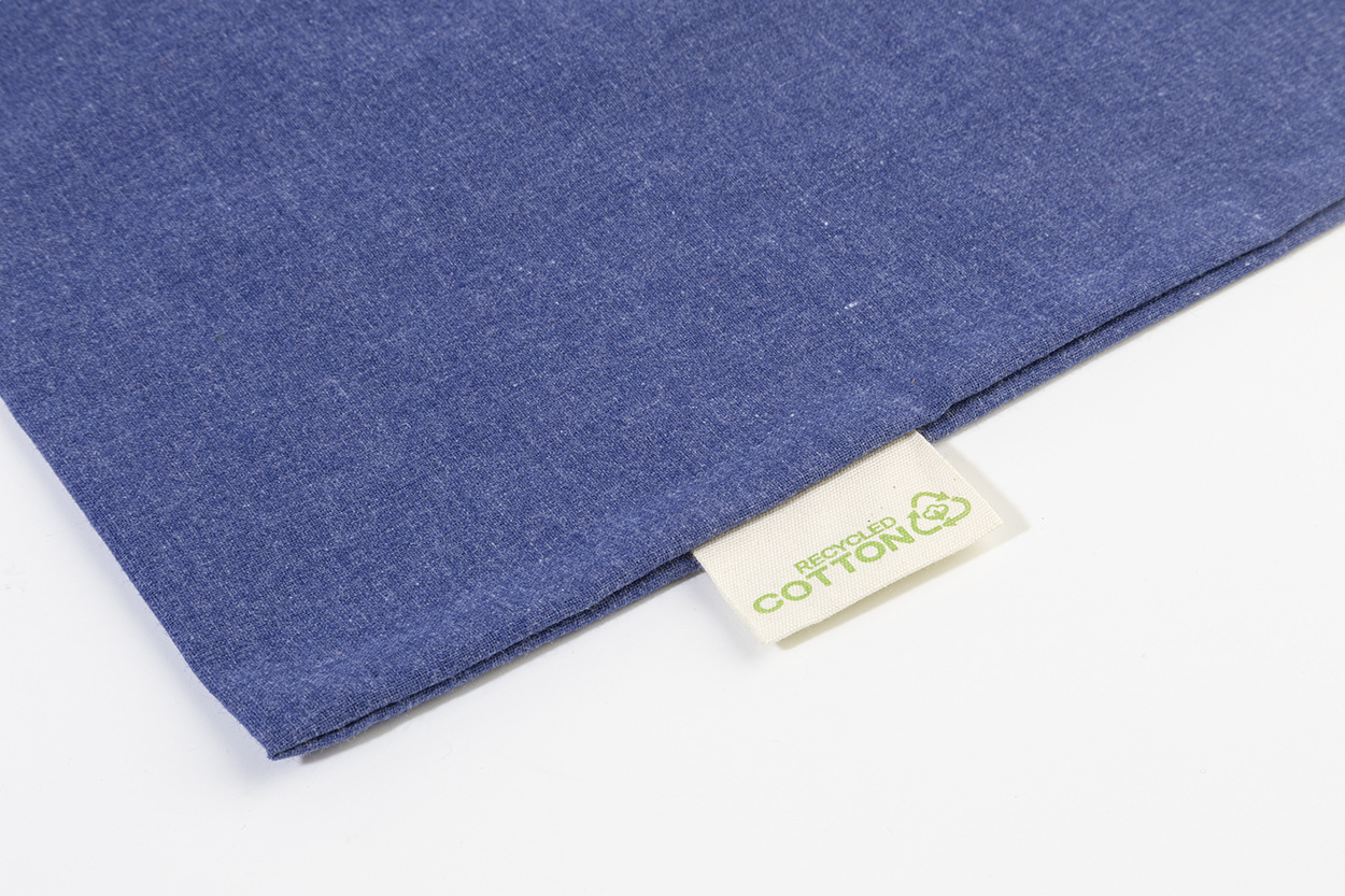 Nákupná taška s dlhými ušami zo 70% recyklovanej bavlny a 30% RPET polyesteru, 140 g/m². S výraznou etiketou o recyklovanej bavlne.