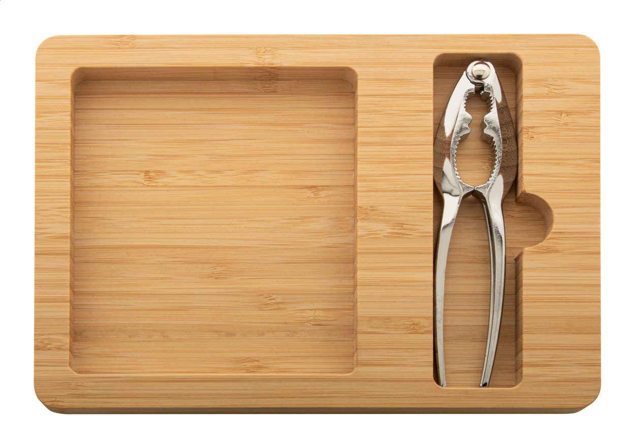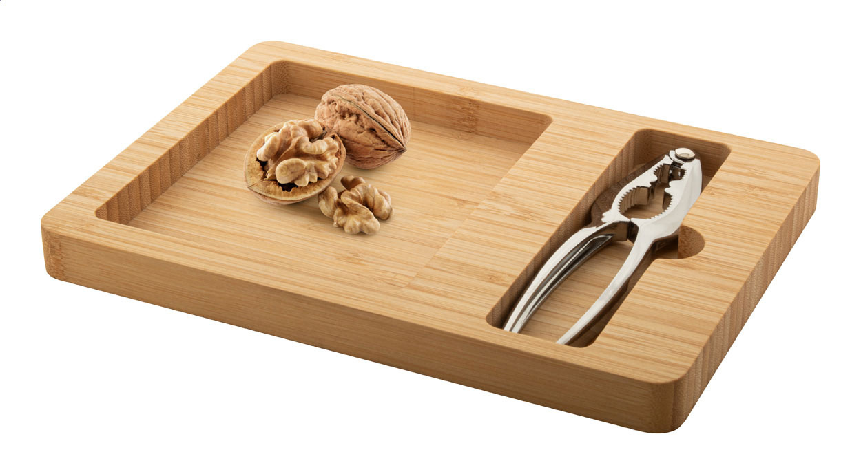 Súprava na lúskanie orechov s bambusovou táckou a kovovým luskáčikom. V kraftovej papierovej krabici.