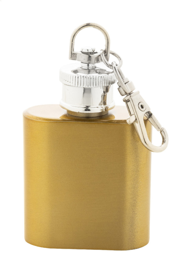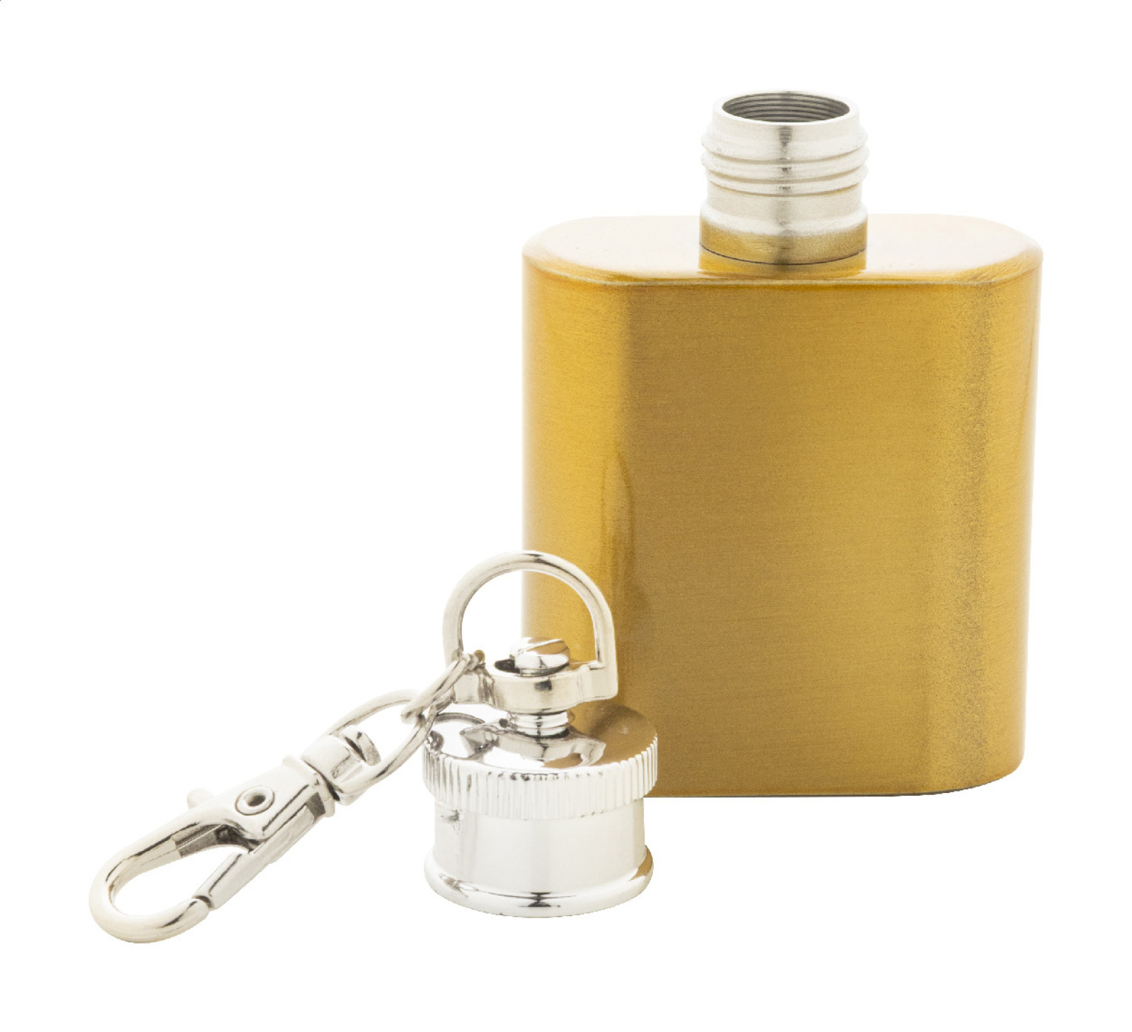 Mini ploskačka z recyklovanej nerezovej ocele s lesklým kovovým povrchom a karabínou na kľúče. 30 ml.