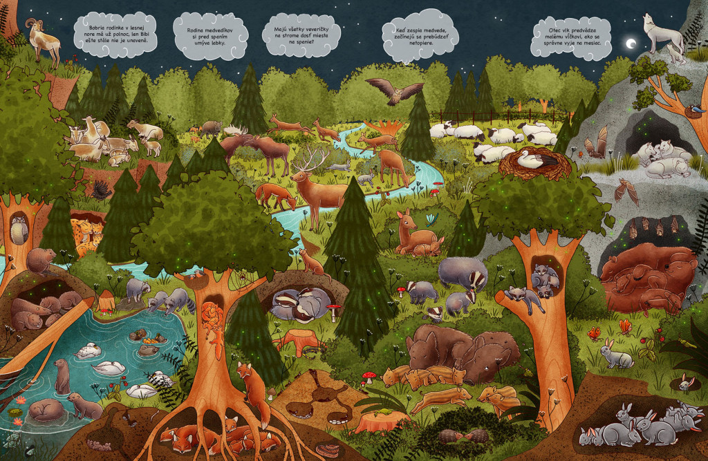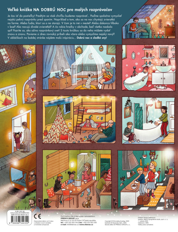 Je čas ísť do postele? Tak potom je ten správny čas siahnuť po tejto kúzelnej obrázkovej knižke! Nájdete v nej bohatú inšpiráciu na každodenné rozprávanie na dobrú noc… Napríklad o tom, ako sa ukladajú na spánok zvieratká na farme. A tiež ľudia, ktorí sa o ne starajú. V čom je to iné v meste? Alebo dokonca hlboko v lese? Ako nocujú divé zvieratá? A čo robia hračky v obchode, keď všetko okolo spí? Pozrite sa, ako ožíva rozprávkový svet. S touto knižkou sa doňho môžete vydávať znova a znova. Dobrú noc a sladké sny!