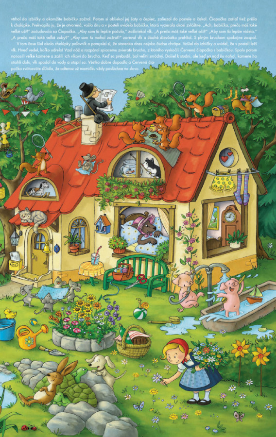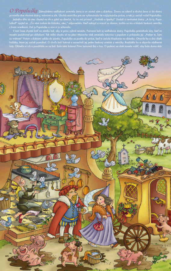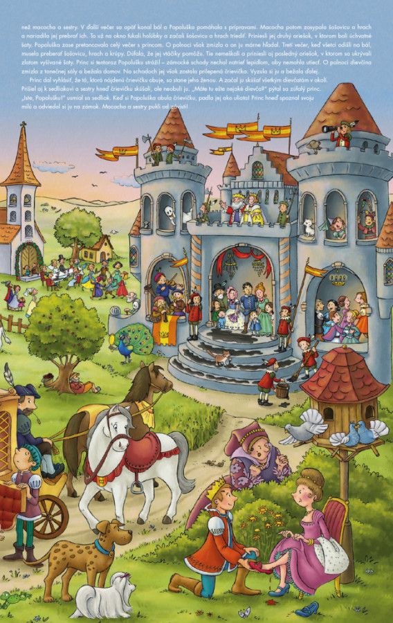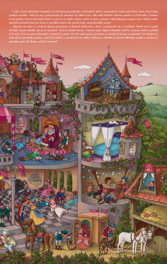 Okrem napínavých dobrodružstiev hlavných hrdinov je tu možné objaviť aj množstvo drobných príhod ďalších rozprávkových postáv, tvorov a netvorov. Stačí len otvoriť knihu, ponoriť sa do rozprávkového sveta a začať ho objavovať. Tak hurá, do toho! Pomôžete princovi nájsť v spiacom zámku s množstvom komnát a tajomných zákutí spanilú Ruženku? A dokážete podľa obrázkov prerozprávať všetky udatné činy statočného krajčírika? Nebudete sa báť v tajomnom nočnom lese, kde ježibaba v perníkovej chalúpke väzní Janíčka a Marienku? A čo takto v chalúpke pri lese, kam sa vydáte s Červenou čiapočkou? Nenechajte sa zmiasť všetkými tými vystrájajúcimi a rozosmiatymi zvieratkami, ktorých je plný kraj a dávajte pozor, koho nájdete v babičkinej posteli! Ostražitosť bude potrebná aj u siedmych trpaslíkov – na Snehulienku má totiž zaostrené zlá macocha a usiluje sa o jej život. Ešteže v rozprávkach vždy dobro zvíťazí nad zlom! O tom by mohla rozprávať aj Popoluška – alebo to radšej skúsite vy, malí čitatelia?