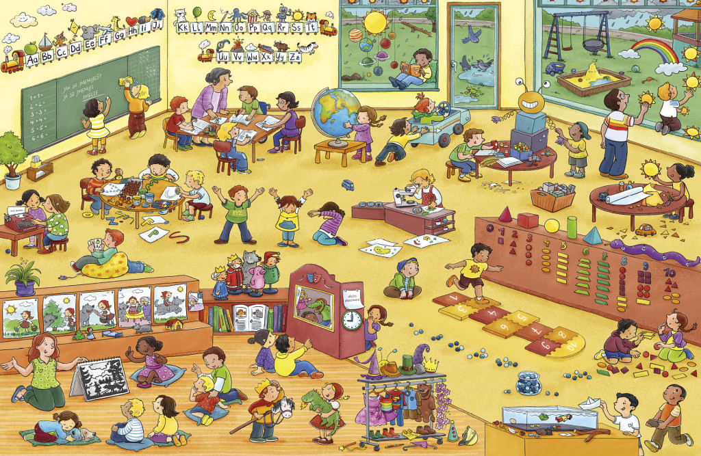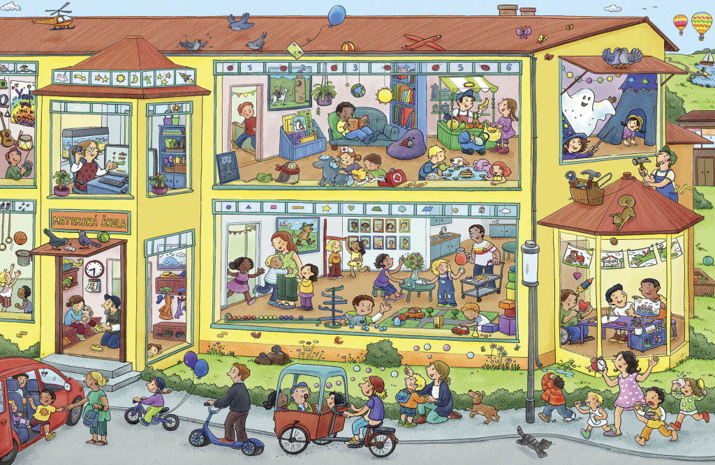 S touto veľkou obrázkovou knižkou prežijete úžasný deň v materskej škôlke, kde je stále živo! Ráno sem mamičky a oteckovia privedú deti a až potom začne tá pravá zábava! Niekto sa hrá, niekto tvorí, iní sa učia, spievajú alebo cvičia. A potom všetci, hurá! von – aj tam totiž čaká plno dobrodružstiev… Čo takto krátky výlet za zvieratkami na farmu? Ale zabudnúť nesmieme ani na povinnosti: pekne sa spoločne najesť, umyť a ísť si po obede zdriemnuť. A na zajtra sa môžeme tešiť na ďalšie stretnutia s kamarátmi. Aj malí čitatelia môžu prežívať škôlkarské dobrodružstvá znova a znova – stačí otvoriť knižku a začať listovať od začiatku!