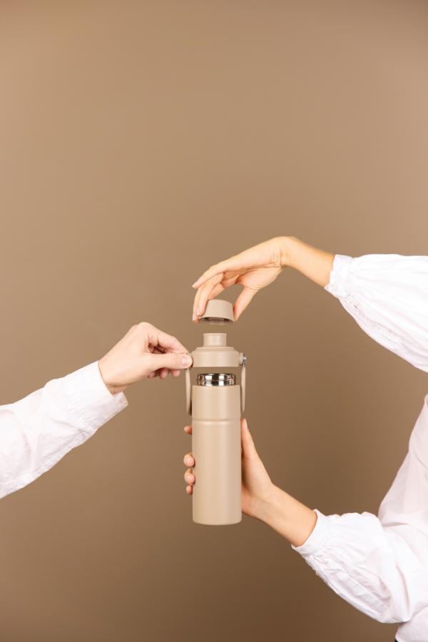 Odolná dvojstenná vákuová fľaša vyrobená z RCS certifikovanej recyklovanej nerezovej ocele s praktickým držadlom. Viečko má dva otvory: horná časť vhodná na pohodlné pitie a väčší otvor na jednoduché dopĺňanie a čistenie. Udrží nápoj studený až 12 hodín a teplý až 4 hodiny. Nie je vhodná do umývačky ani do mikrovlnnej rúry, iba ručné umývanie. Certifikované RCS (Recycled Claim Standard), certifikácia RCS zaručuje, že celý dodávateľský reťazec recyklovaných materiálov je certifikovaný. Celkový obsah recyklovaného materiálu je založený na celkovej hmotnosti výrobku. Tento produkt obsahuje 65% RCS certifikovanej recyklovanej nerezovej ocele.