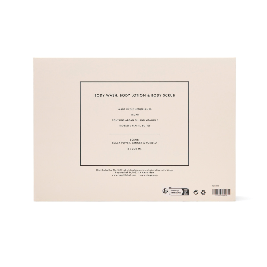 Premeňte každé sprchovanie alebo kúpeľ na luxusný rituál. Táto unisex trojdielna sada obsahuje 200 ml tuby sprchového gélu, telového peelingu a telového mlieka, ktoré vyživujú pokožku od hlavy po päty. S hrejivou a sviežou vôňou čierneho korenia, zázvoru a pomela zanechá pokožku jemnú, sviežu a príjemne prevoňanú. Elegantne balené v darčekovej krabičke v krémovo-bielej a čiernej farbe.