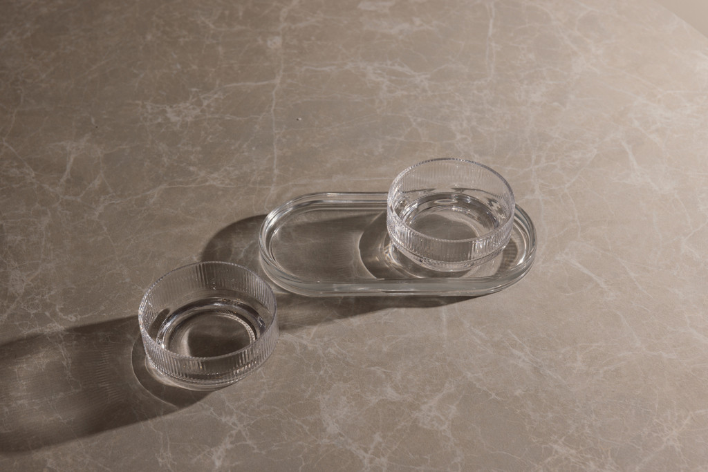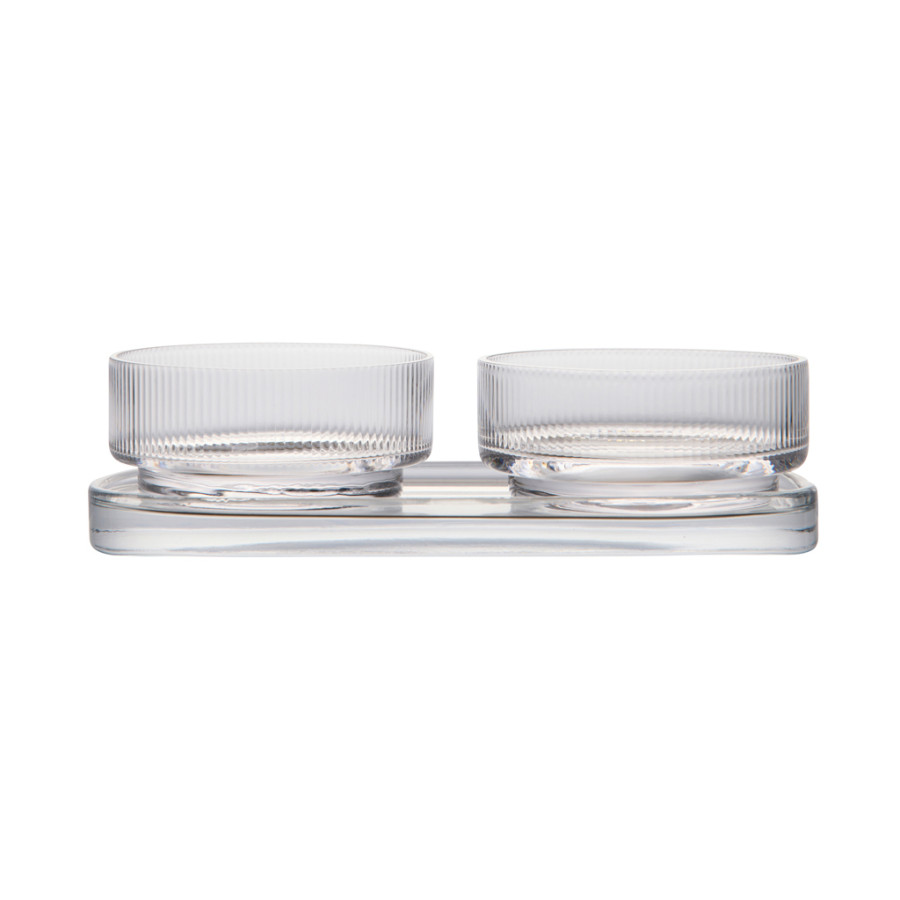 Sada na tapas s nadčasovým dizajnom a klasickými, čistými líniami. Ideálna na každú príležitosť, kde chcete štýlovo a elegantne servírovať malé jedlá, občerstvenie alebo iné prílohy. Sada obsahuje dve misky a podnos, ktoré sa dajú používať spoločne alebo samostatne. Vyrobené zo sódovo-vápenatého skla. Misky majú objem 250 ml. Vhodné do umývačky riadu.