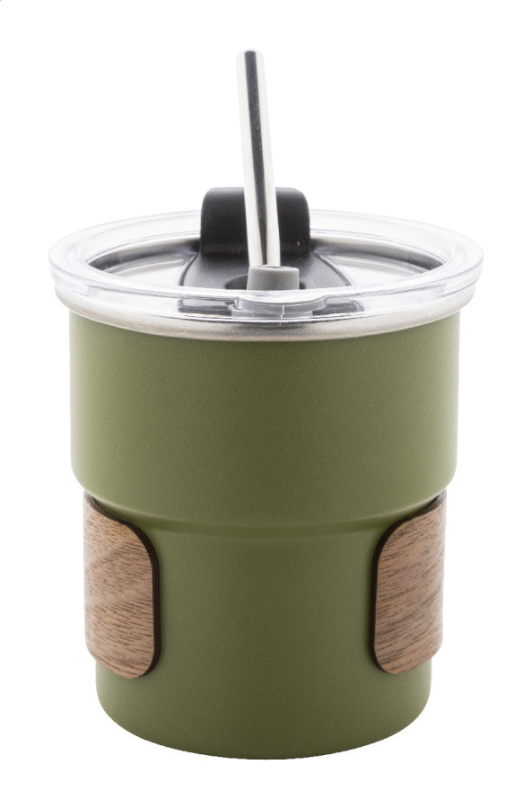 Jednostenný cestovný hrnček z recyklovanej nerezovej ocele s rukoväťou z orechového dreva, plastovým viečkom a slamkou z recyklovanej nerezovej ocele. 260 ml.