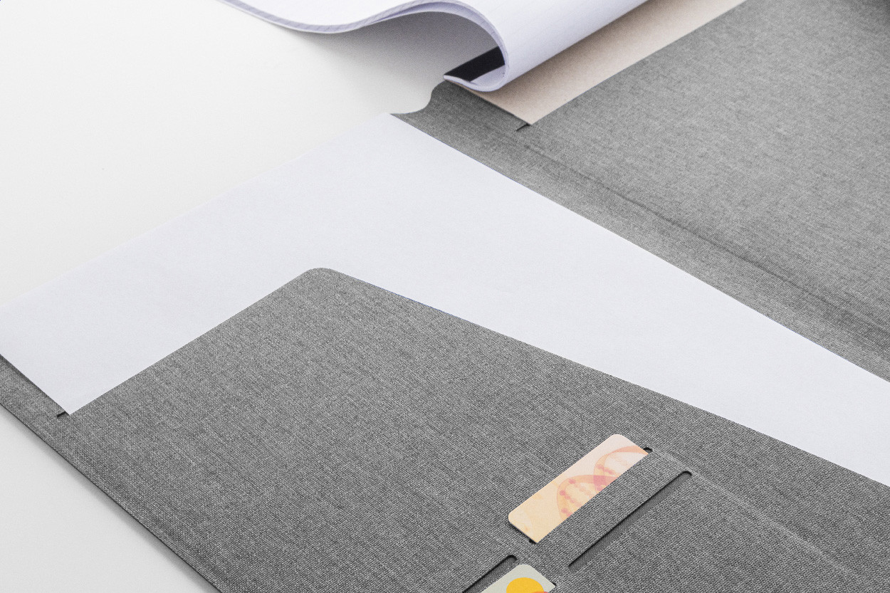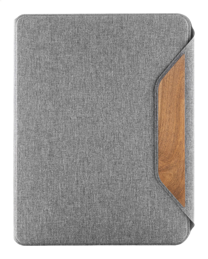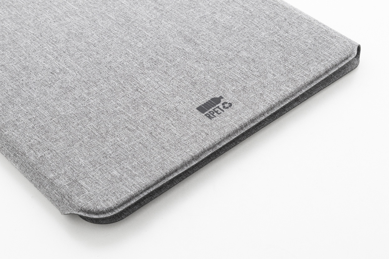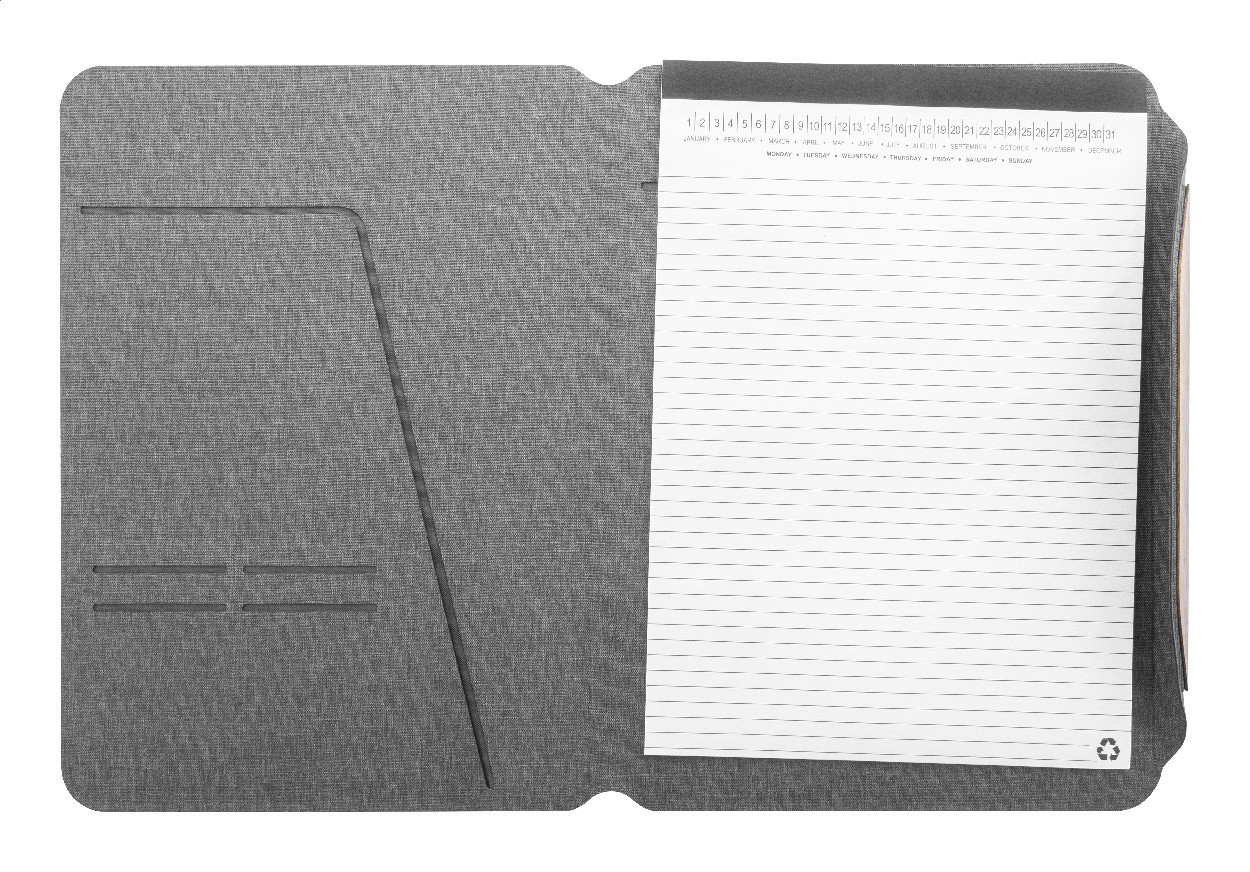 Zložka na dokumenty A4 z RPET polyesteru s niekoľkými vnútornými vreckami a magnetickým zapínaním s detailmi z orechového dreva. S linkovaným blokom z recyklovaného papiera s 20 listami.