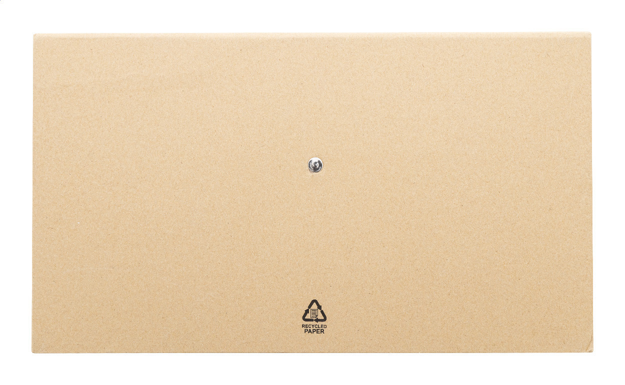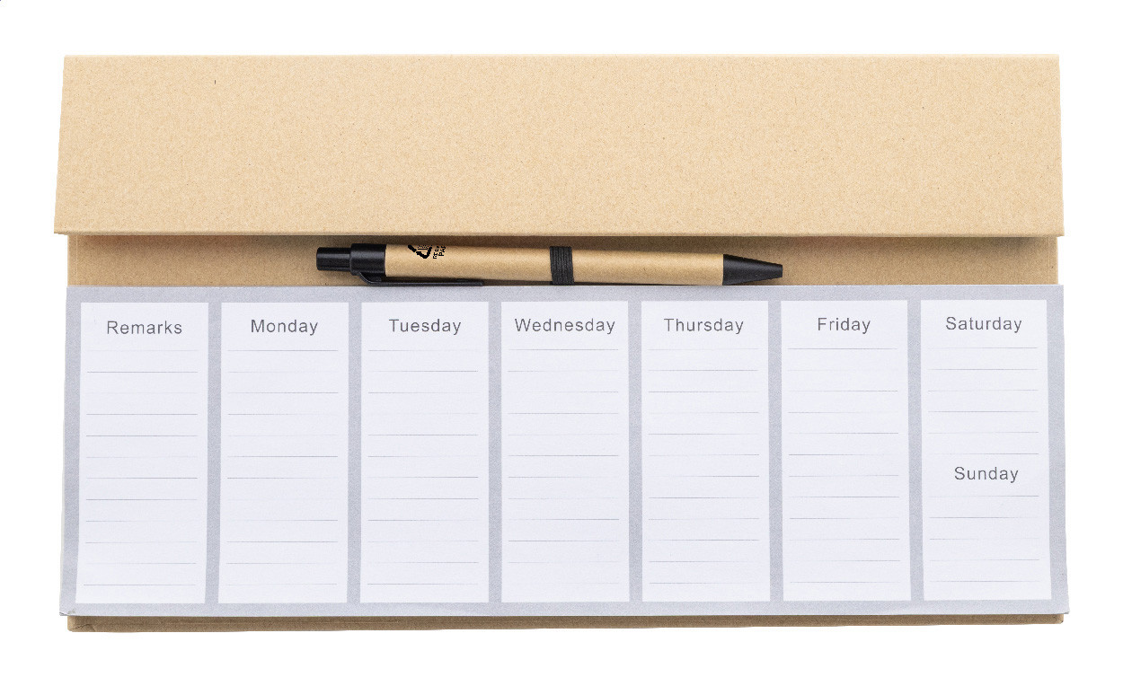 Stolový plánovač z recyklovaného papiera s 50 nedatovanými týždennými plánovacími listami, 100 samolepiacimi papierikmi (v 4 farbách) a 125 značkovačmi stránok (v 5 farbách). Vrátane guľôčkového pera z recyklovaného papiera s modrou náplňou.