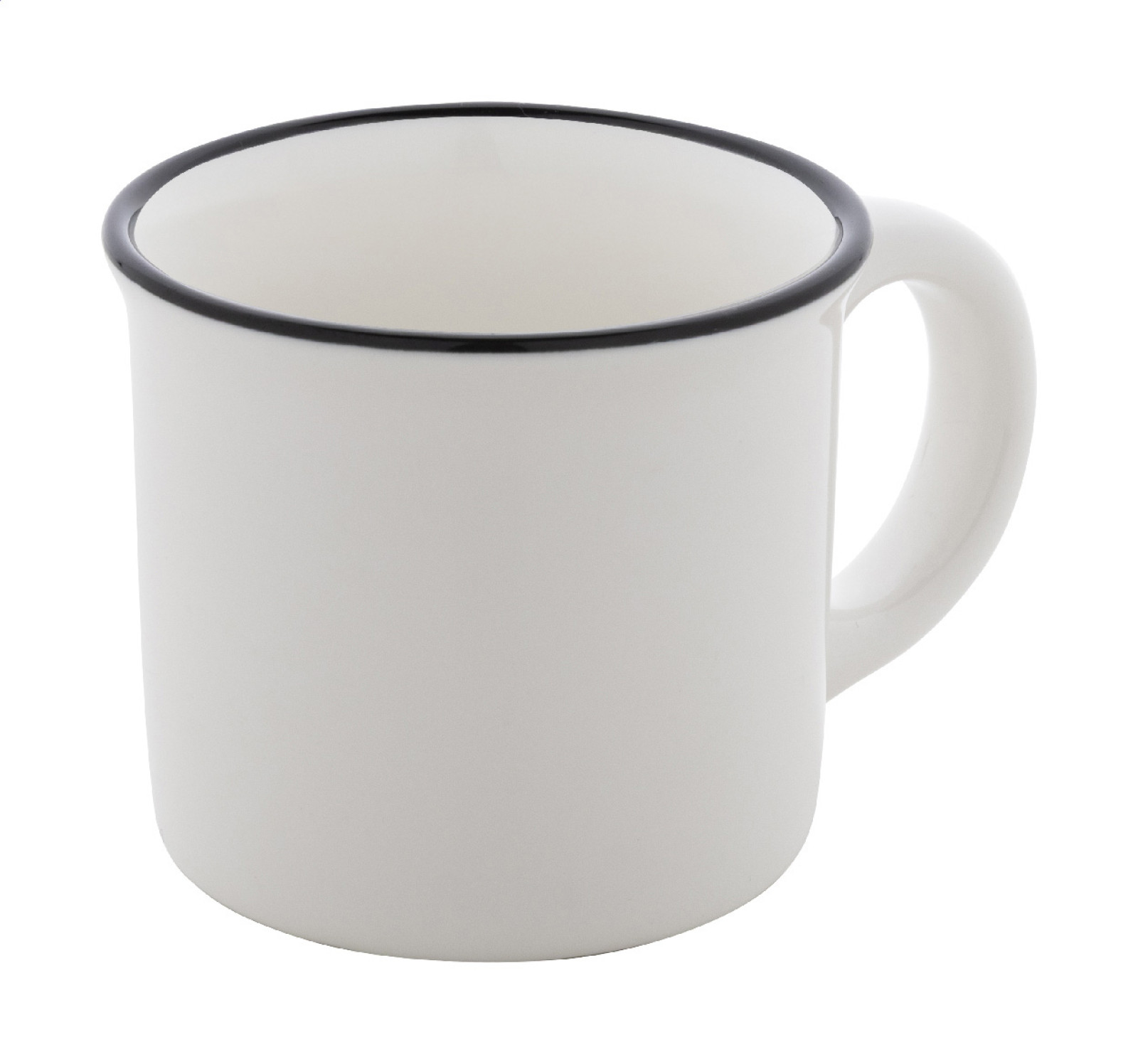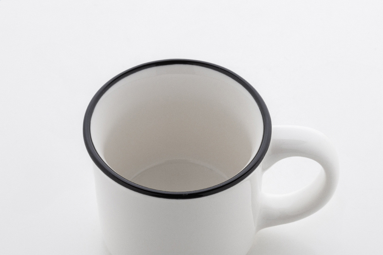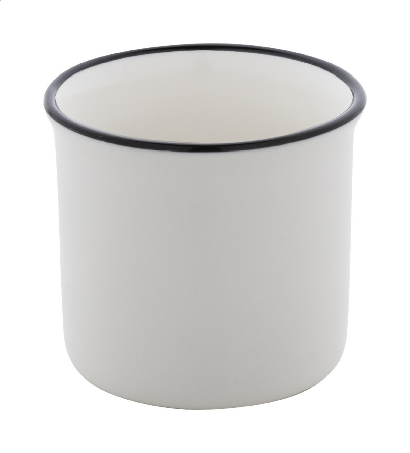 Mini vintage keramický hrnček s čiernym okrajom, bielym vo vnútri a farebným vonkajškom, 90 ml. V krabičke z kraftového papiera.
