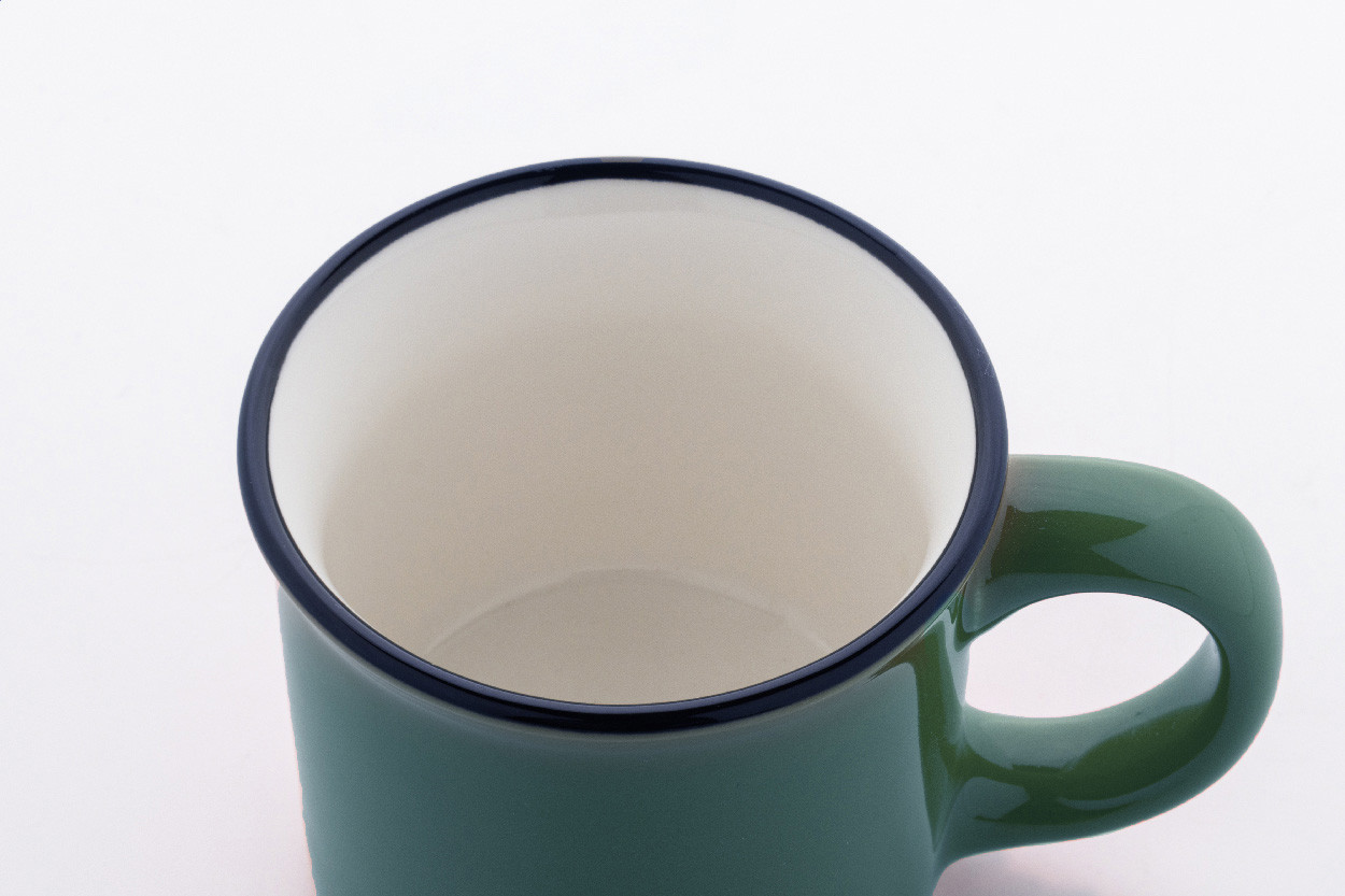 Mini vintage keramický hrnček s čiernym okrajom, bielym vo vnútri a farebným vonkajškom, 90 ml. V krabičke z kraftového papiera.