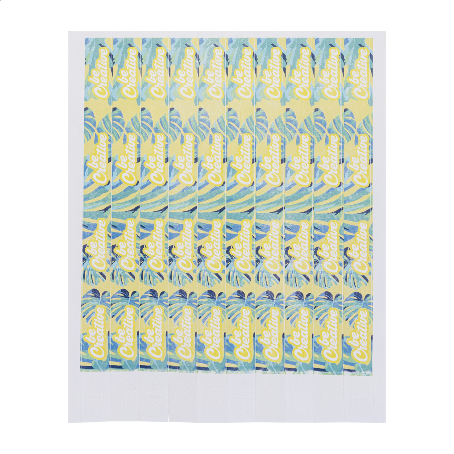Jeden list 19 mm širokých tyvekových náramkov s farebnou potlačou (10 ks) s lepiacim bezpečnostným uzáverom a jedinečným číslovaním. Cena zahŕňa digitálnu potlač na prednej strane, nezahŕňa tlačovú prípravu. Min. mn.: 50 ks (500 náramkov).