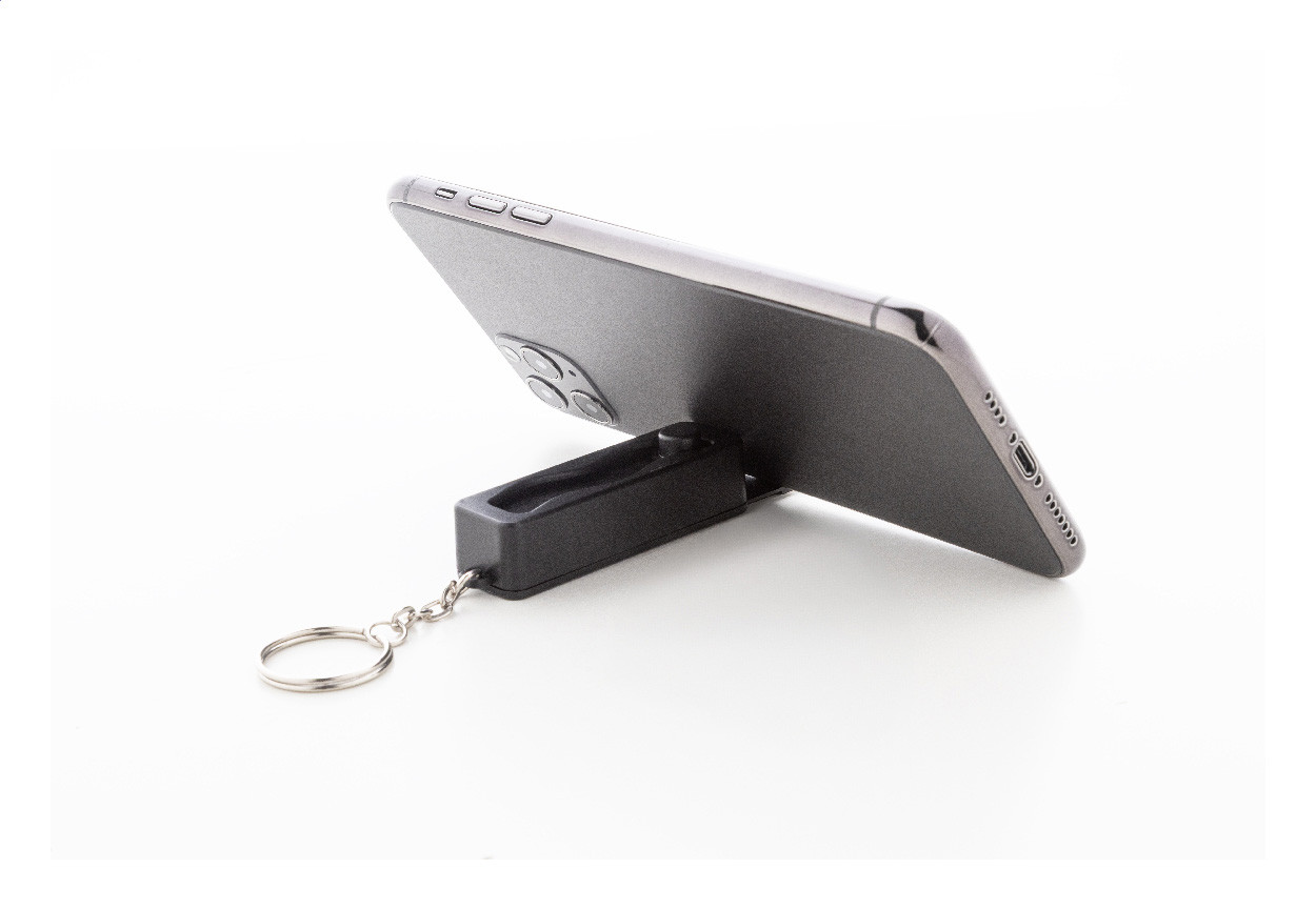 Antistresový prívesok na kľúče fidget z recyklovaného ABS materiálu s integrovaným držiakom na mobil a kovovým krúžkom.