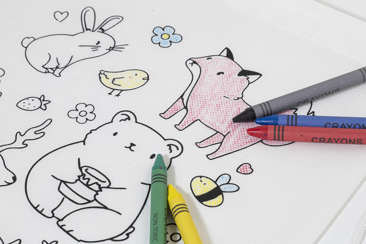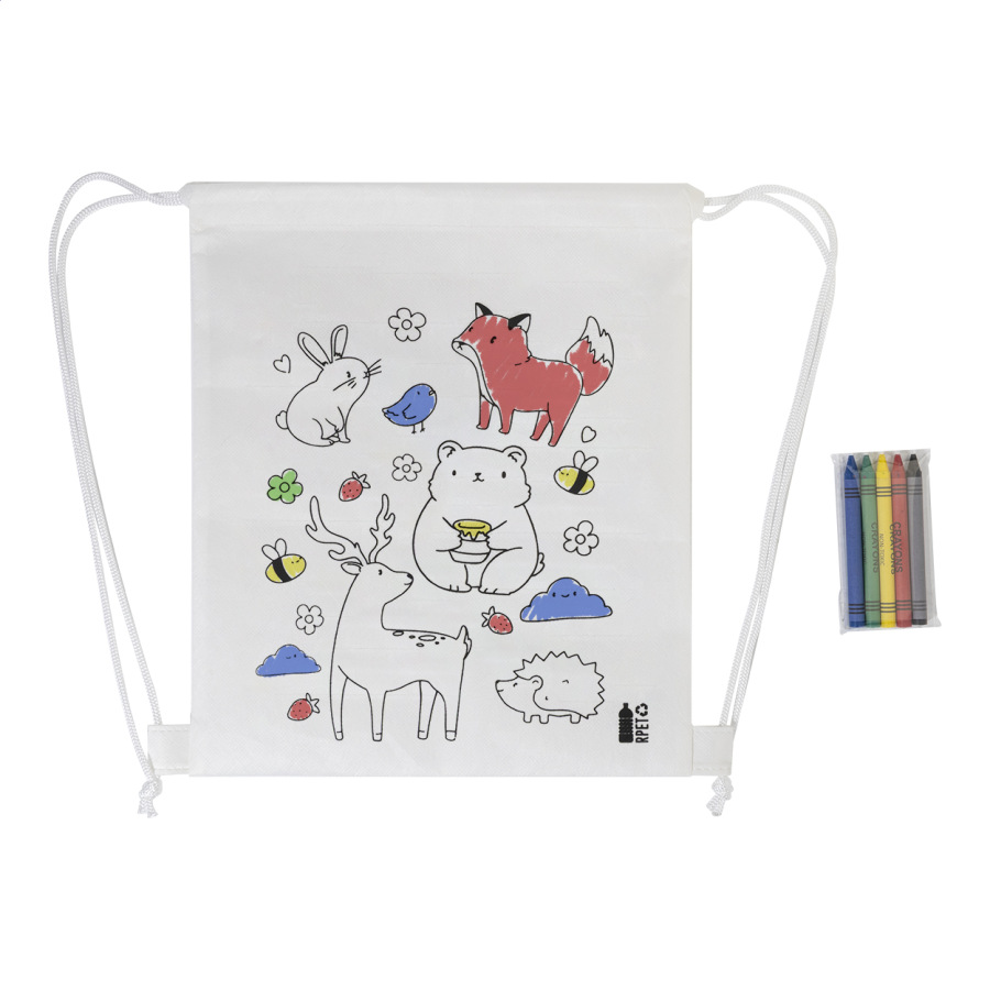 Vak so sťahovacou šnúrkou pre deti z netkanej RPET tkaniny s 5 voskovkami na vyfarbenie.